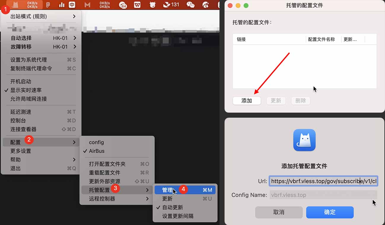 - 点击Clash托盘图标 > 配置 > 托管配置 > 管理