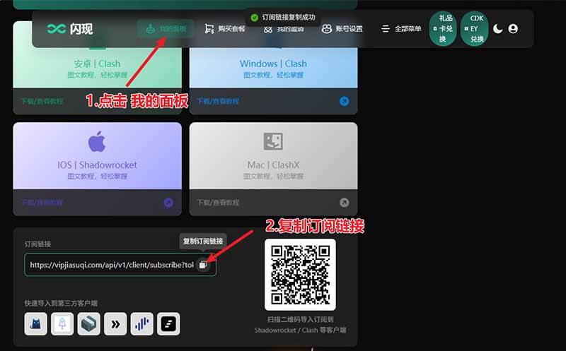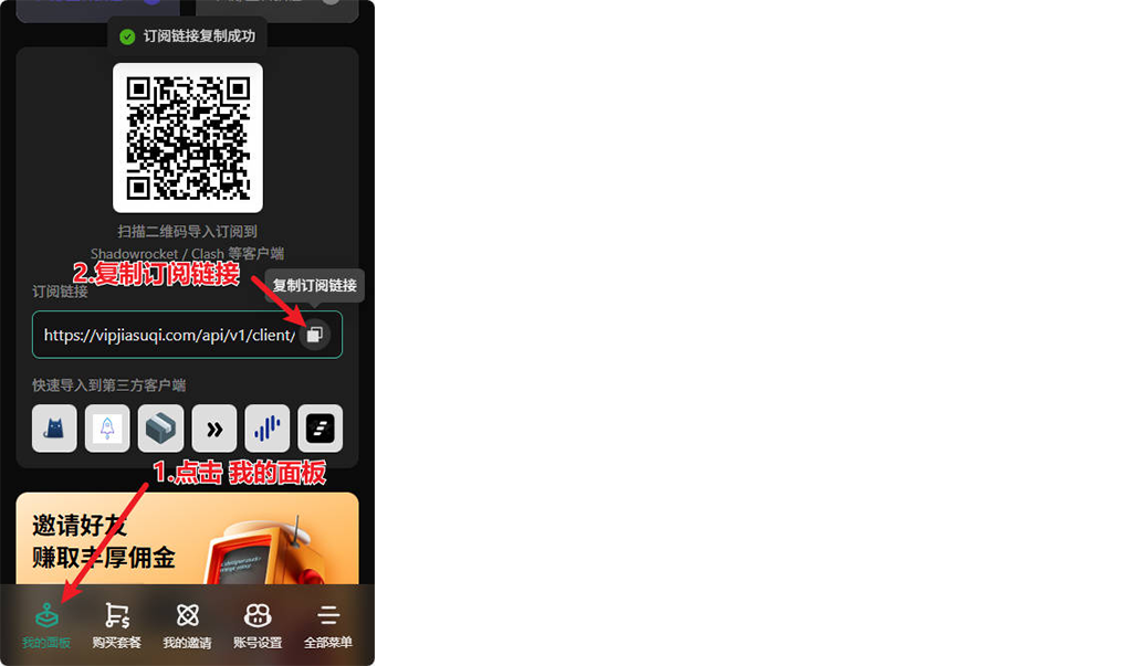 - 请前往【我的面板】➤【复制订阅链接】